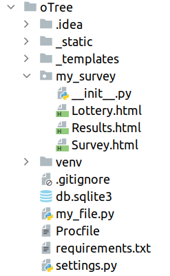 settings.py: oTree settings filemy_survey folder: the app in our oTree project. We apps on our own.