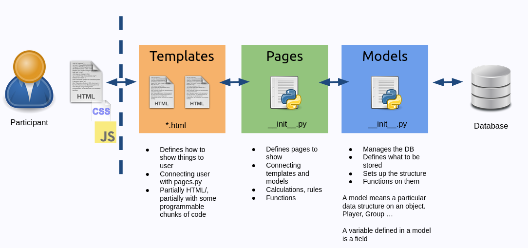__init__.pypage_sequence listhtml template in the same folderTemplates use HTML codes, and oTree template items (indicated by {{ }}).
